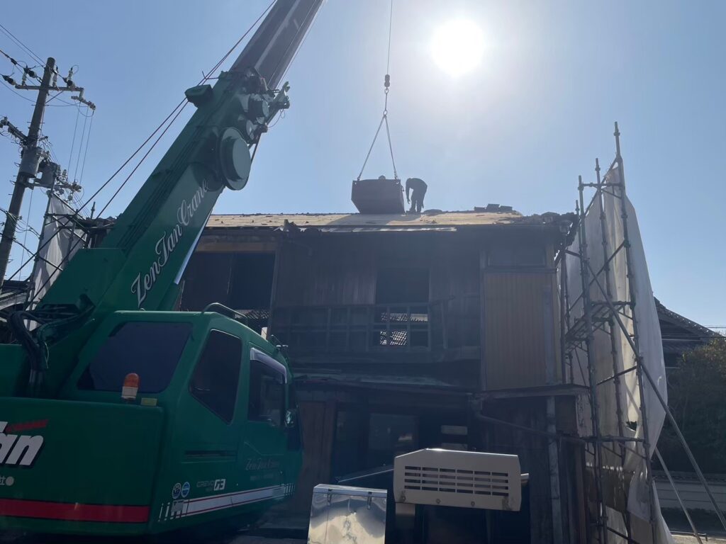 今回は、瓦屋根だったため、クレーンと兼用で一枚一枚手作業で解体していきました。