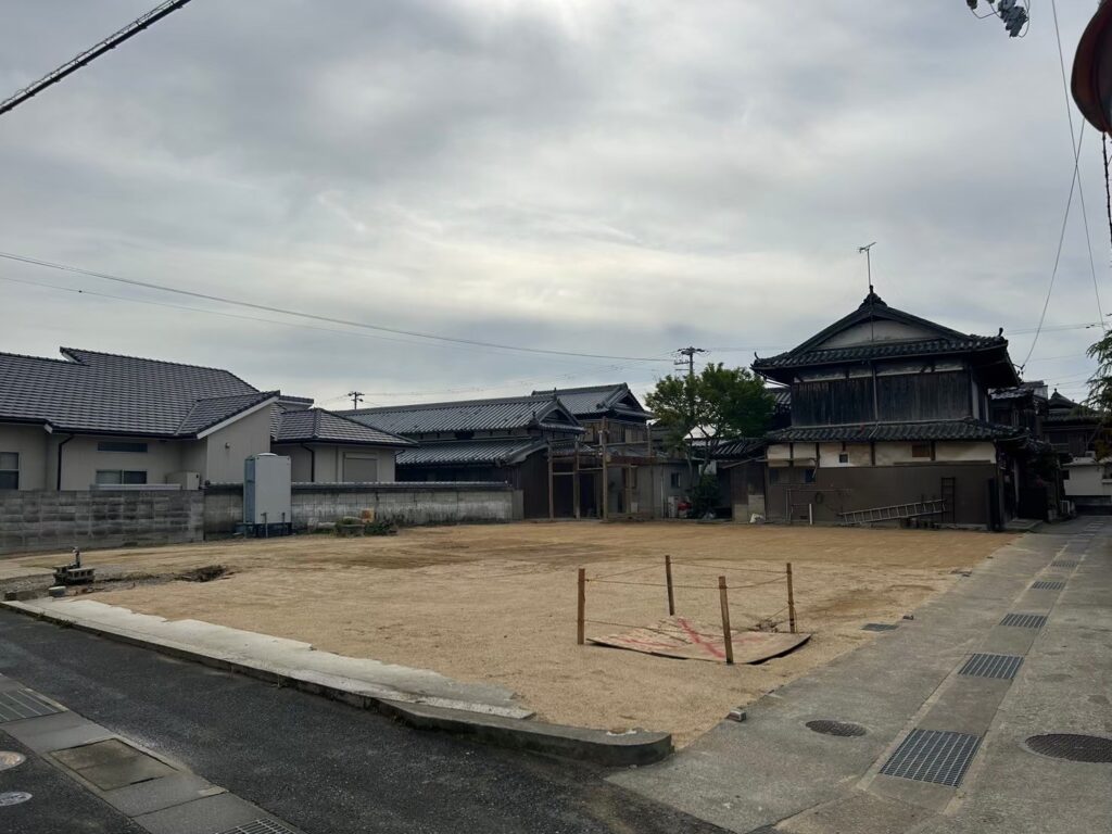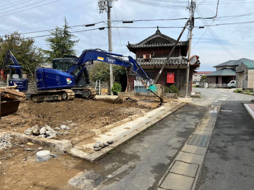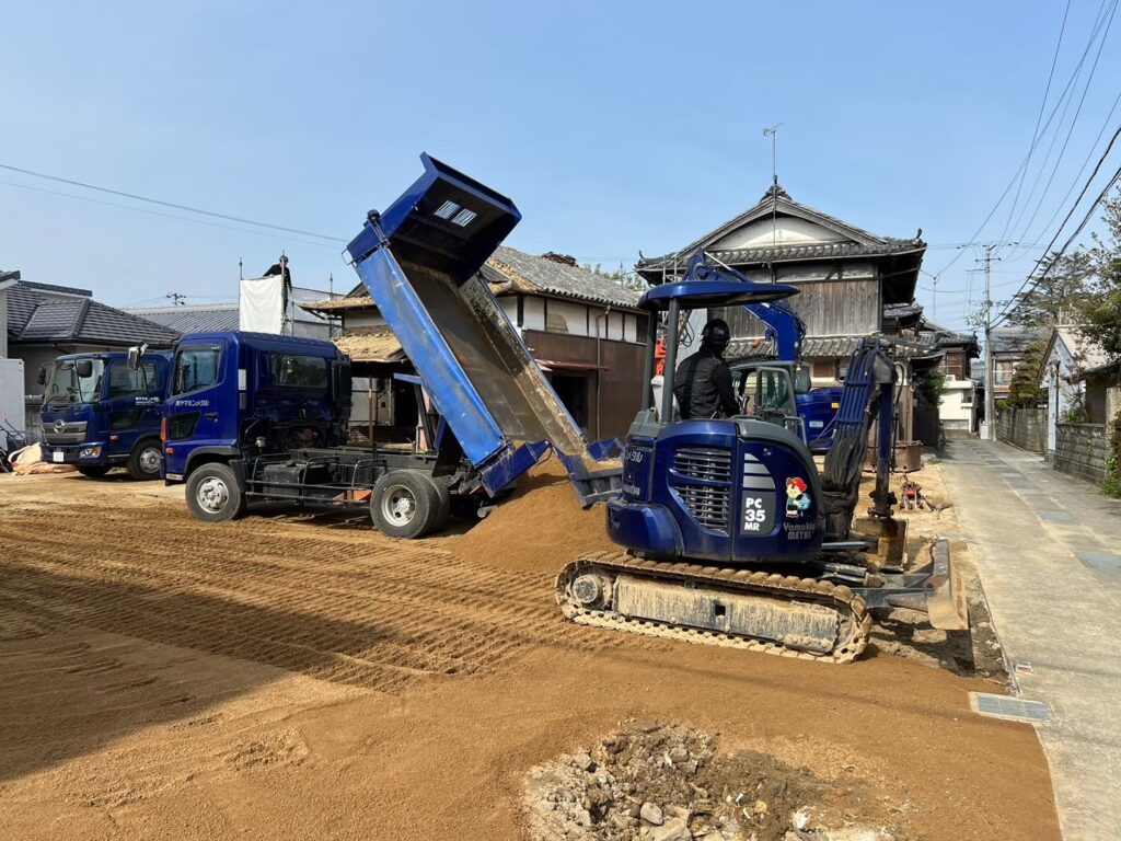 基礎・土間撤去後、真砂土を入れ、重機で整地・転圧していきます。