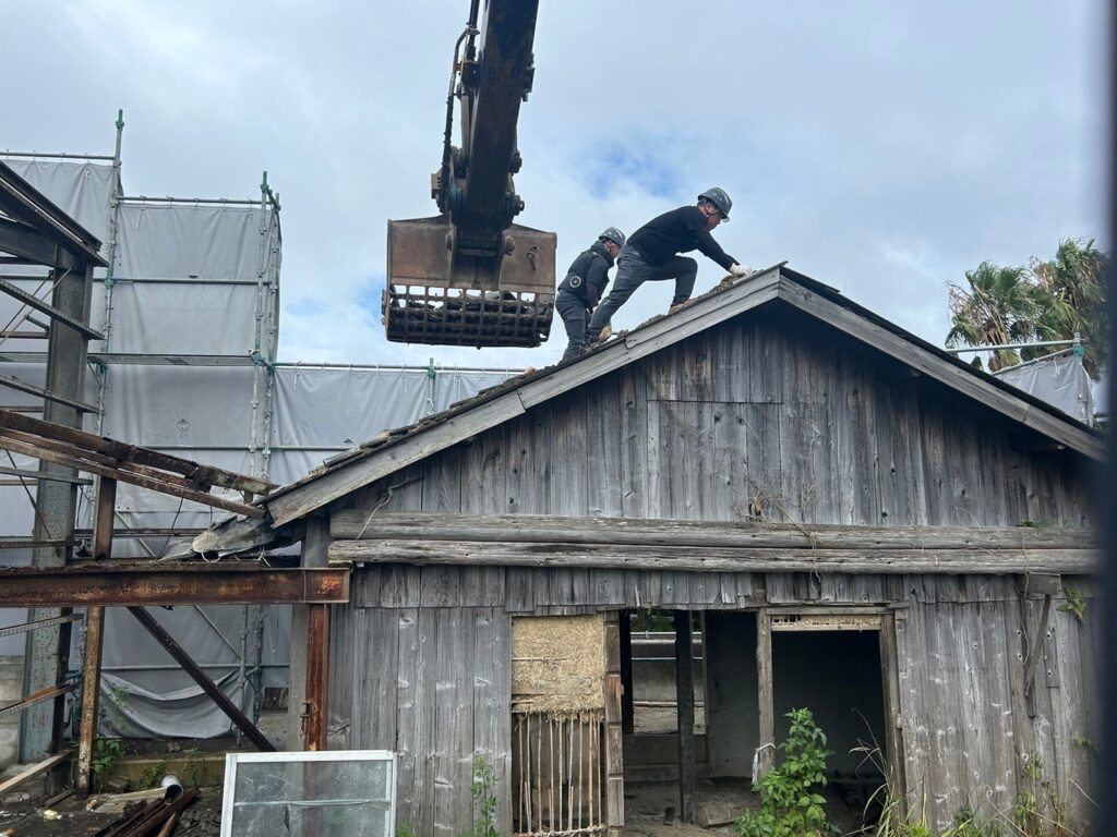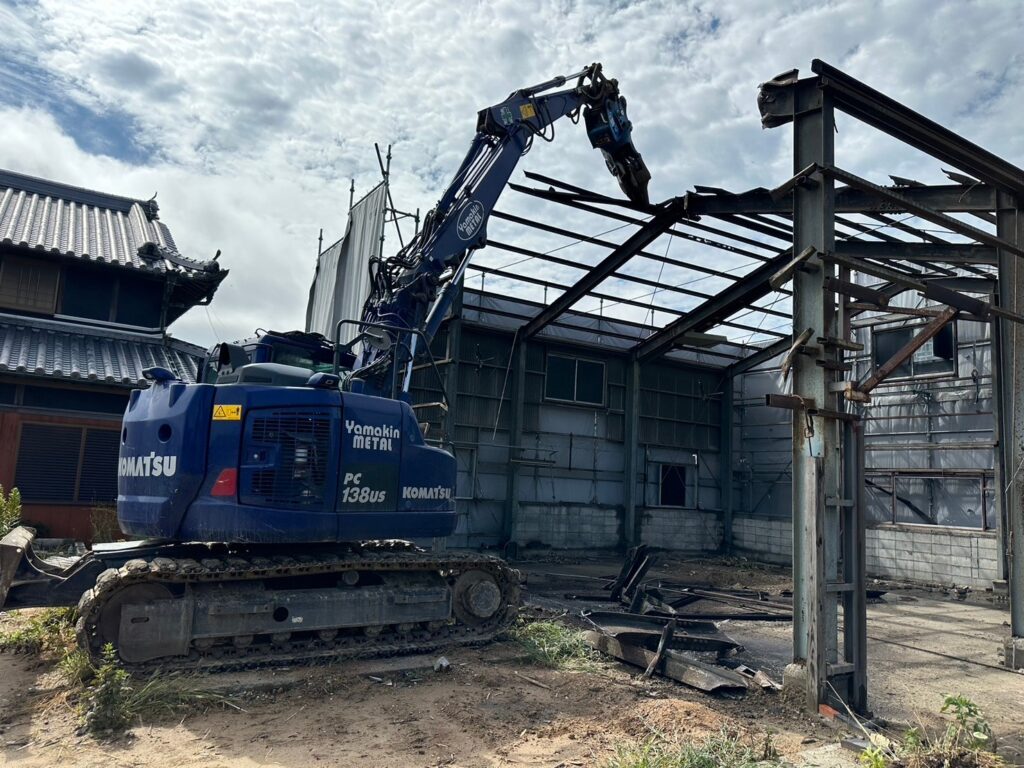 スレート撤去後、重機PC138US-11で鉄骨カッターを使用し、鉄骨部分を切断し解体していきます。