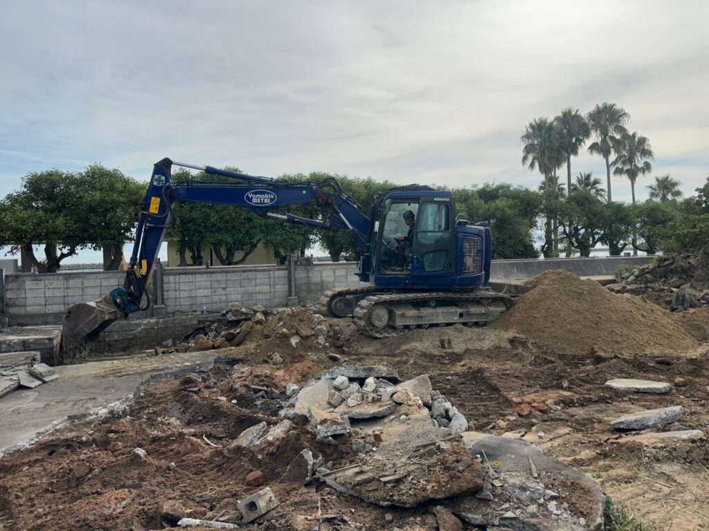 今回は重機PC138-USで大割機とバケットを使用し基礎と土間コンクリートを撤去し、更地に仕上げていきます。