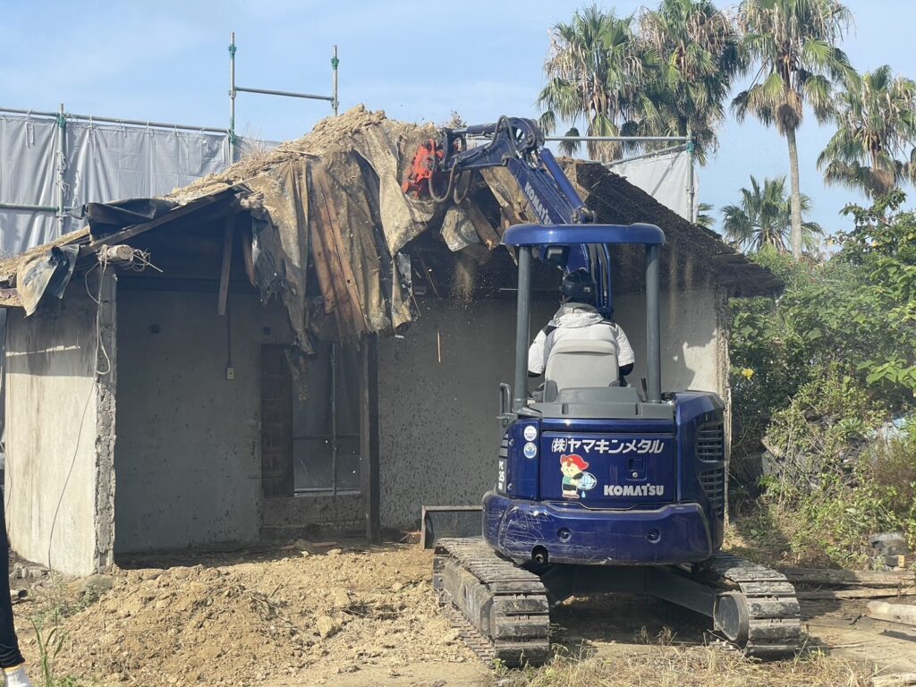 屋根瓦撤去後、重機PC35MR-3でフォーク使用して上部構造体を解体していきます。