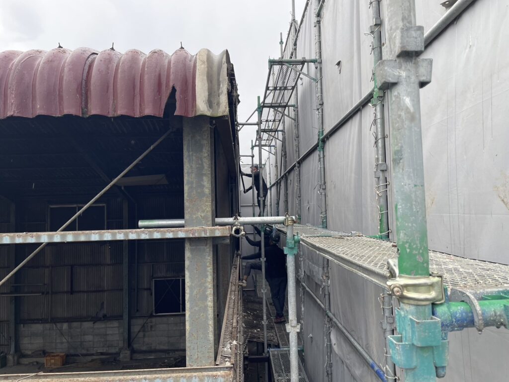 屋根、壁スレートを破損させずに丁寧に手ばらしで取り外していきます。