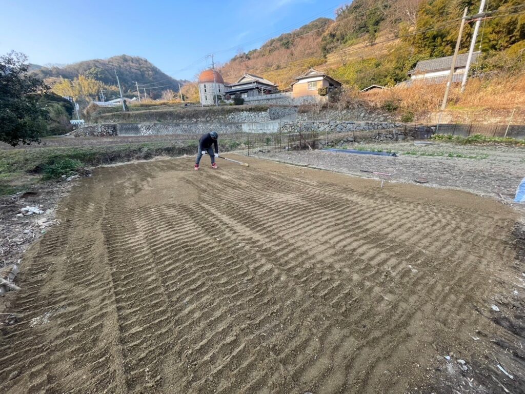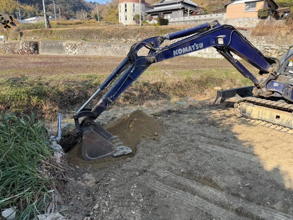 基礎撤去後、真砂土を入れ、重機PC35MR-3を使用して転圧・整地していきます。