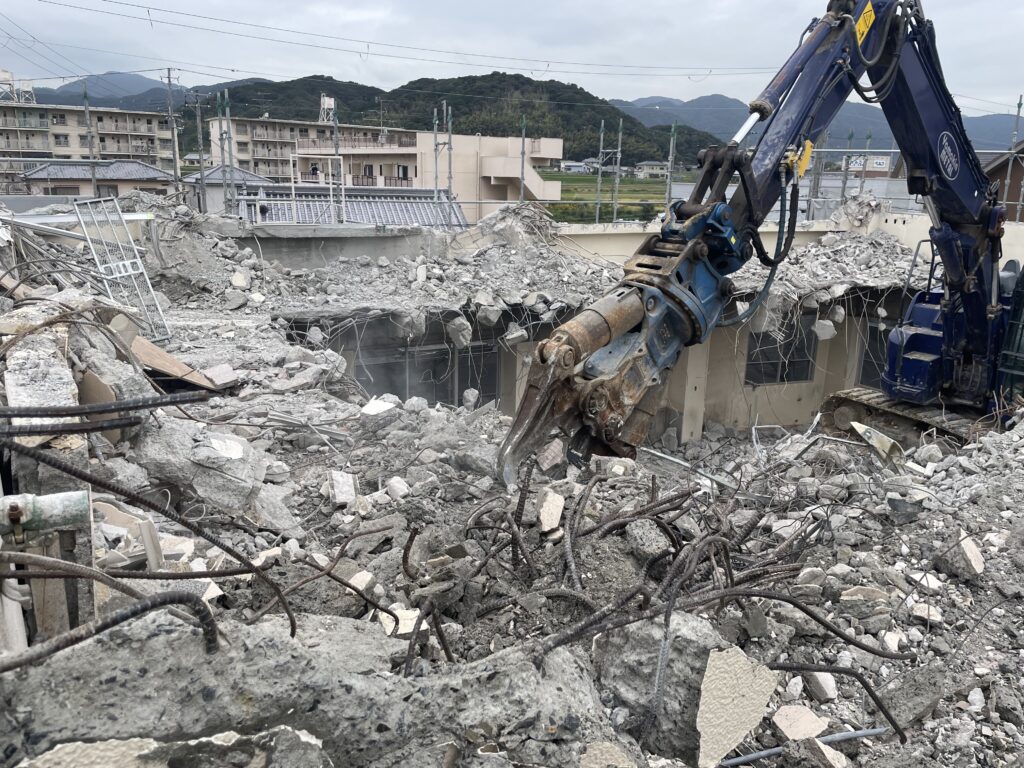 洲本市宇原の解体作業では、重機PC210LC-11で大割機を使用して上部構造体を解体していきます。