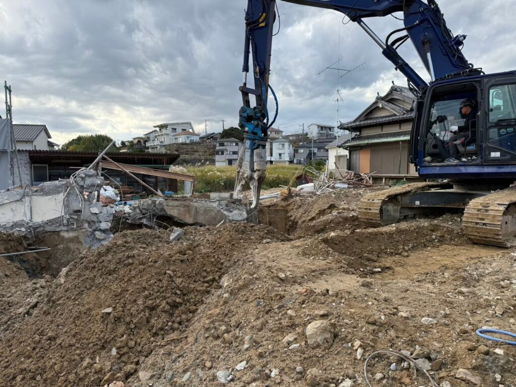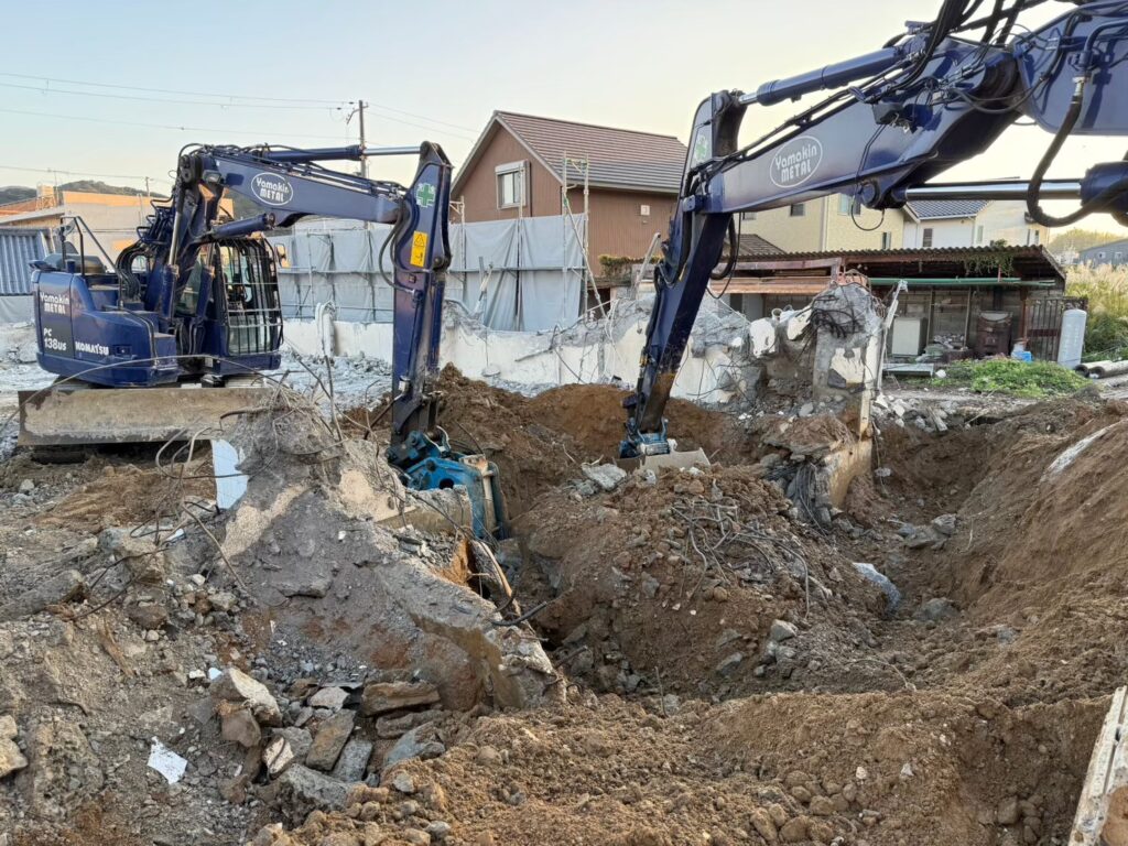 今回の洲本市宇原の基礎の解体作業では、重機PC210LC-11でミキシングバケットと重機PC138US-11で油圧ブレーカー、大割機を使用して基礎と土間コンクリートを撤去し、更地に仕上げていきます。