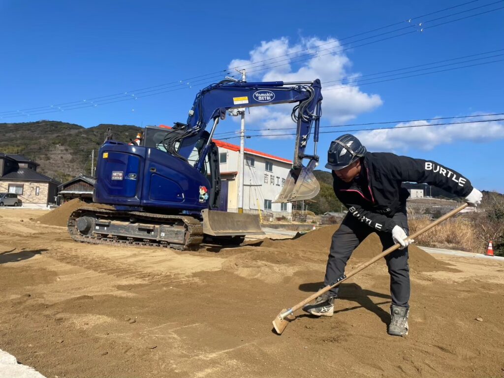 基礎・土間コンクリート撤去後、真砂土を入れ、重機SK75SRDと重機PC35MR-3を使用して転圧・整地していきます。