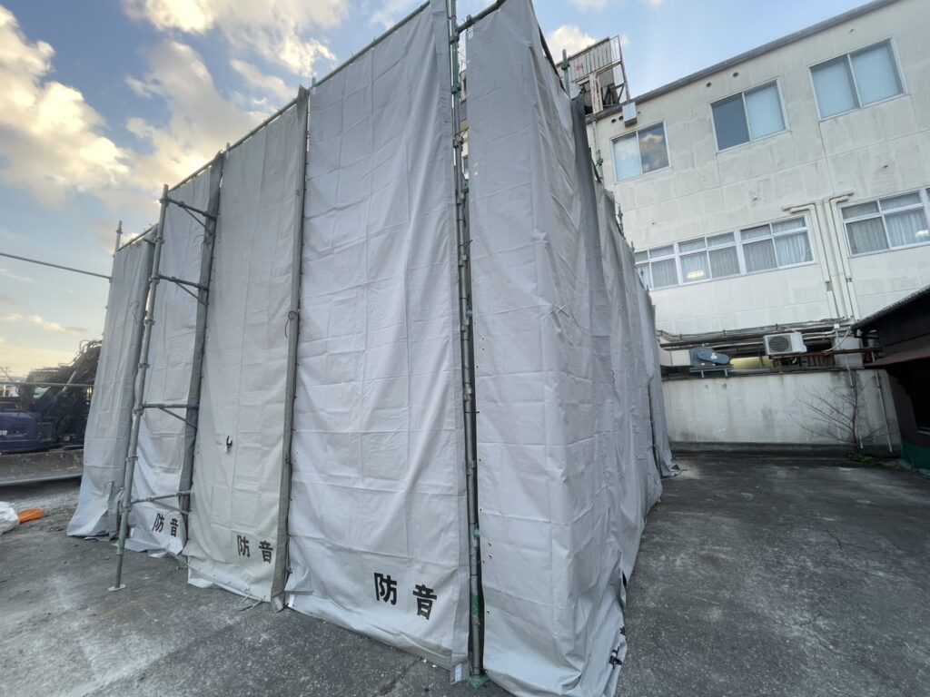 解体工事では、作業開始前に足場と養生を設置します。