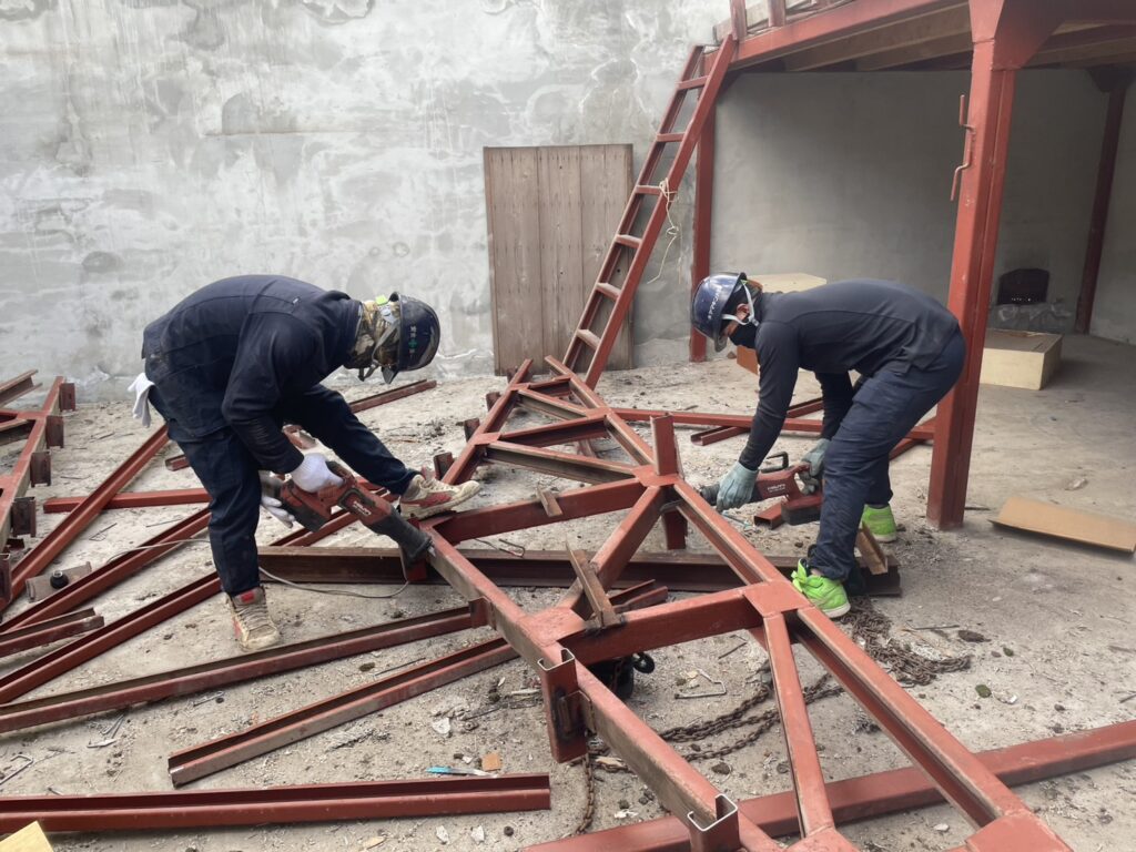 屋根スレートを撤去してから上部構造体の解体作業に入ります。