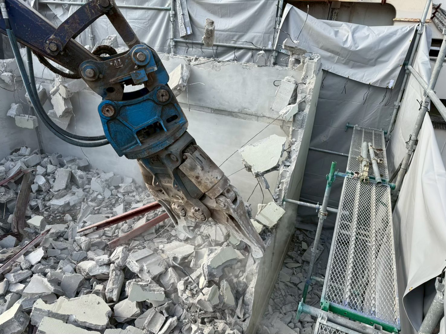 粉じんや破片の飛散を防ぎ、周辺環境への影響を抑えるための重要な工程です。