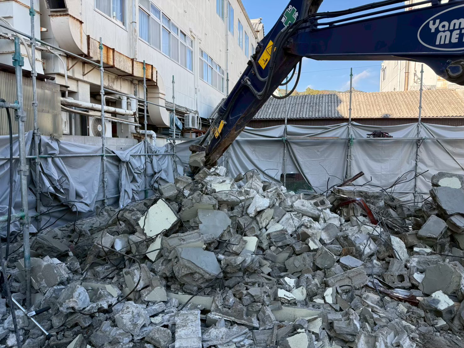 南あわじ市福良乙の建物解体作業では、鉄骨部分をセーバーソーを使用し手作業で解体してから、重機PC138US-11でコンクリートブロック造解体に欠かせない専用アタッチメントの大割機を使用し、周囲に配慮しながら建物を解体しました。