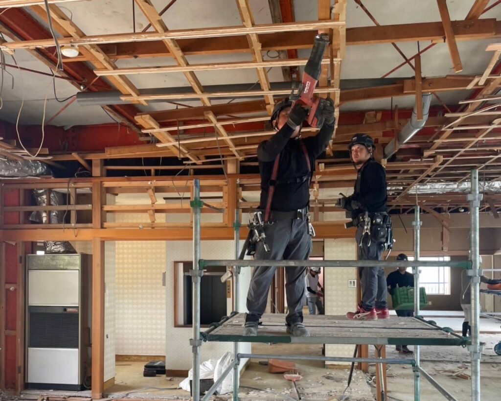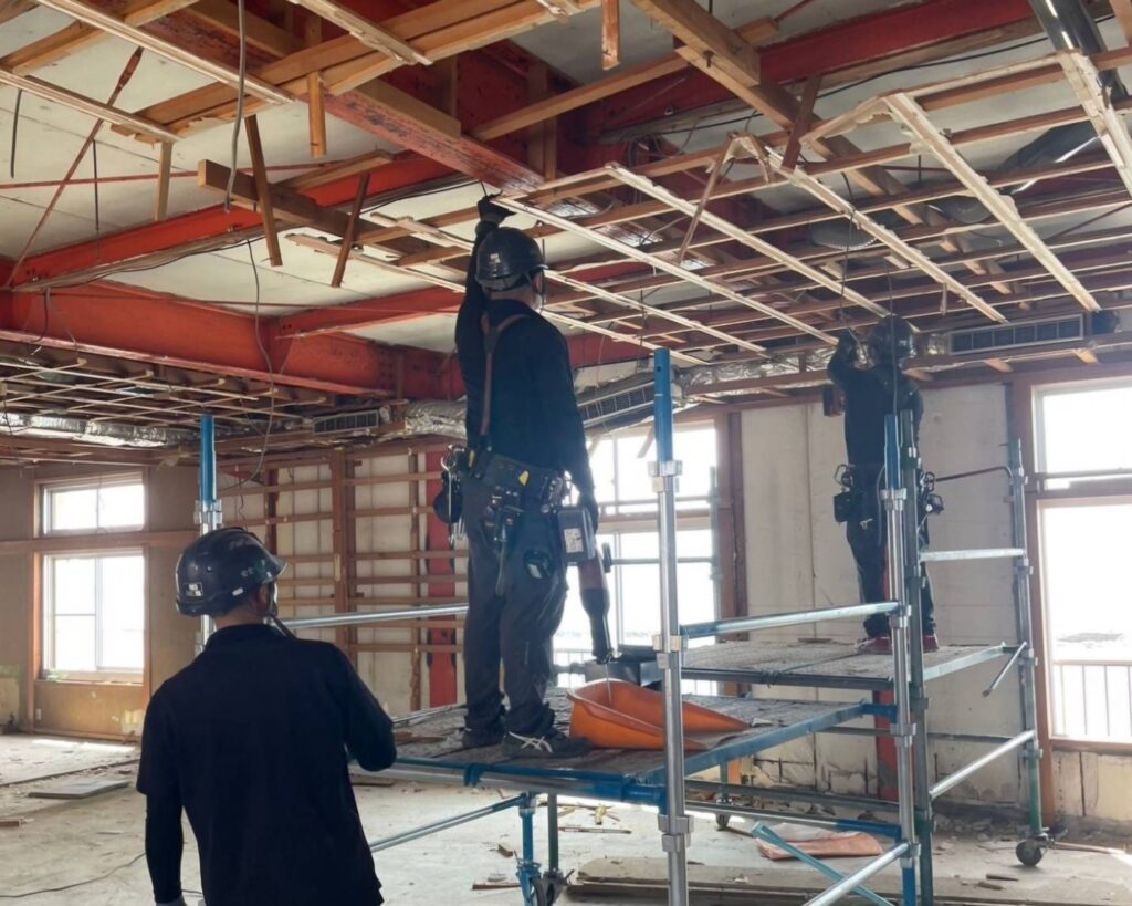 天井作業では、ローリング足場を使用して安全に作業していきます。