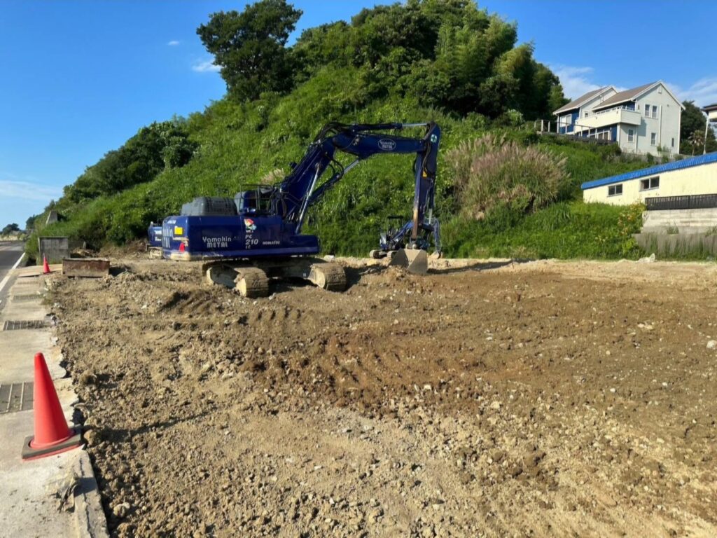 基礎・土間撤去後、現地土を流用し、重機で整地していきます。